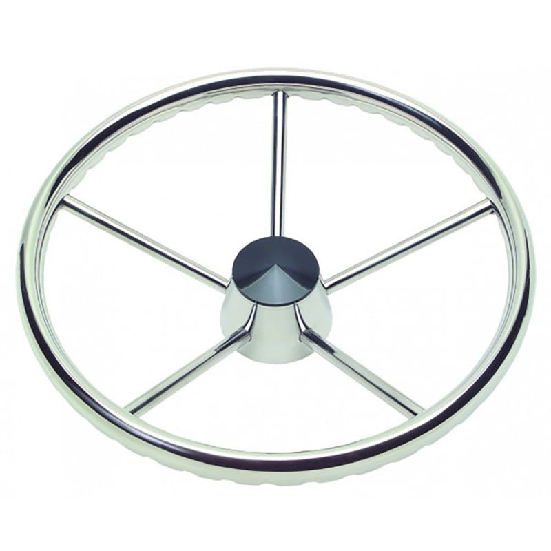 The Destroyer Wheel is a 5-spoke stainless steel steering wheel that can be a great addition to any boat. This specific steering wheel comes with a fitted black center cap.